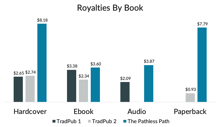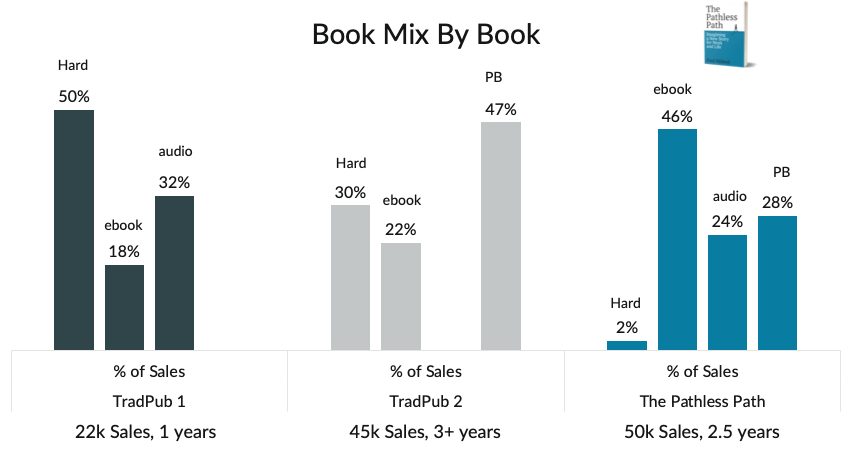 With TradPub Book 2, I don’t have audio data but it’s majority paperback. This is due to one major order from a top retailer for the book. This is another thing that I don’t have access to.