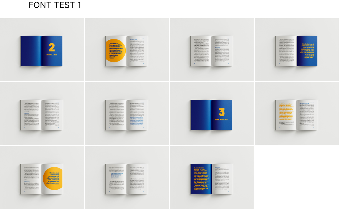 From there, we decided to do one or two blues, on cream pages, testing some of the following colors